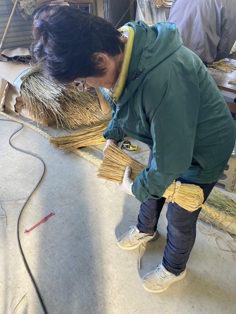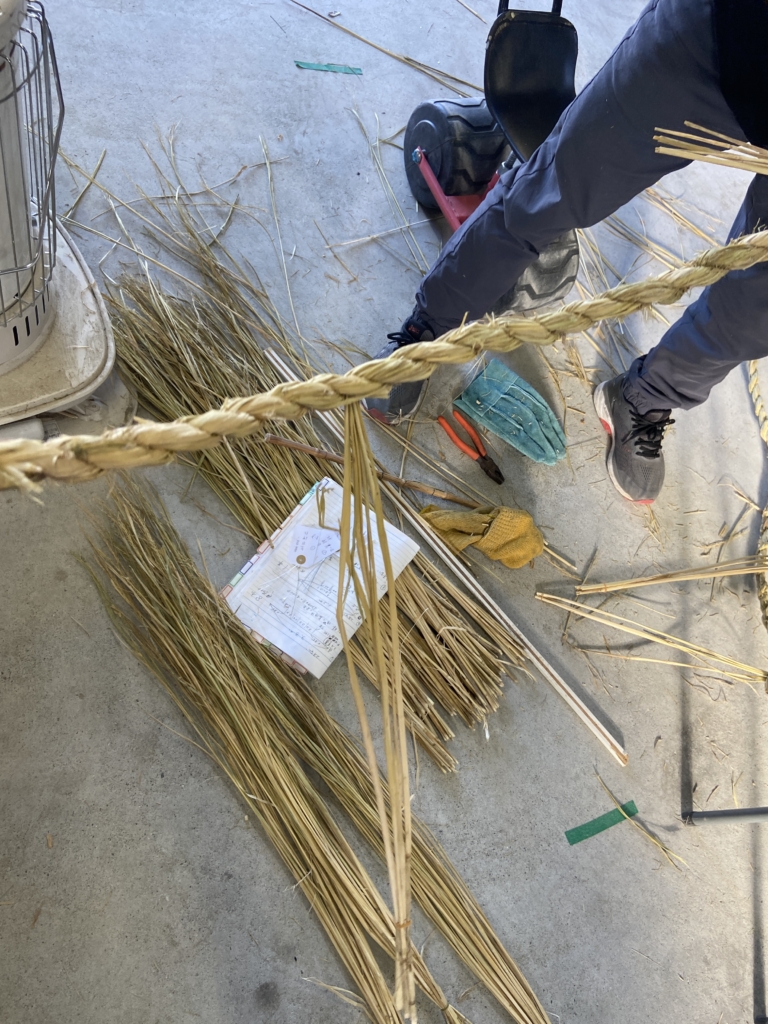 取材の日、その場の勢いで作業を手伝うことになりました。昔は駒を回す紐縄は自作していたし、納豆も藁から作っていた家庭に育った私は、作業のハードルはさほど高くなく、藁の感触を懐かしみながらお手伝い。その上、周りから「筋が良い」と結構褒められます。そうなると、俄然やる気スイッチが入って約1時間、しっかりお手伝いやりました。ちょっとしたコツがありますから、慣れていないと変に力が入ってしまいます。私も自分の手が痛くなっていることに気が付きます。