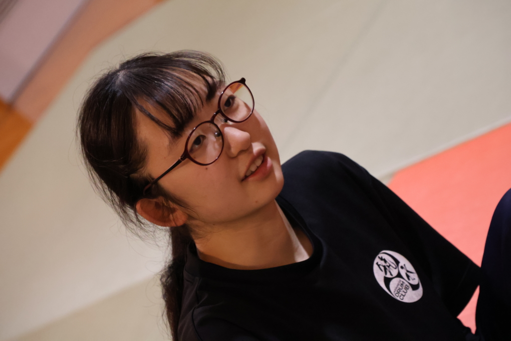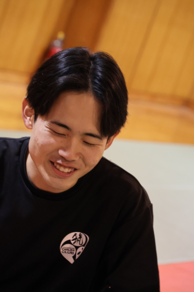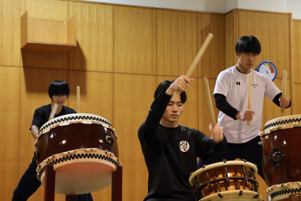 雑談をしながら、準備を始める部員の皆さん。リラックスした雰囲気で笑い声が柔道場に広がっています。そんな空気の中、いざ、演奏スタート。和太鼓の音と掛け声とともに、一瞬で部員のまなざしは変わります。
