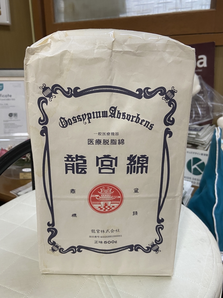 「こんにちは」と梯代表が入ってこられました。驚きました。にこやかな笑顔です。とっても優しく迎えてもらいました。応接室ではじめに目に入ってきたのは「龍宮綿」の文字。これ、小学生ぐらいまで見たことがあることをうっすらと思い出してきました。自宅の救急箱の横に入っていたという記憶がしっかりあります。この赤の「龍宮城」のロゴマークと昭和の香りのする字体と紙袋、田主丸を母に持つ私にとっては、実は身近な会社でした。
