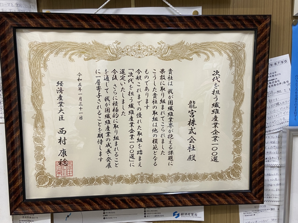 社長にお話を伺いました。「龍宮」という会社名のこと、現在の中心商品「パシーマ🄬」のこと、そして今後について。1時間程度の時間を予定していましたが、あっという間に時間は過ぎていきました。とても濃い内容で、現在に至るまでの苦労が一筋縄ではいかなかったことを教えてくれました。とても(もちろん私の力量のなさもあります)書ききれるものではありません。私が、かなり困った顔をしていると梯社長が渡してくれました。梯社長自身の著書「一品勝負」(幻冬舎2022)と、先代社長で父親でもある梯禮一郎社長の著書「綿にかけた男」(現代書林1996)。