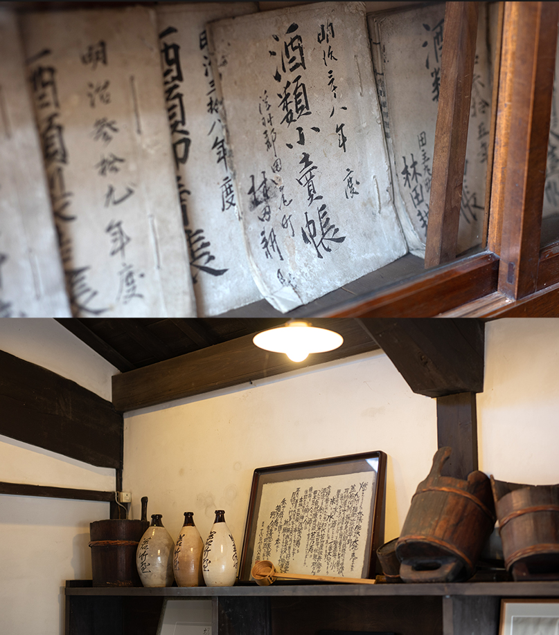 蔵の中は、お酒が仕込まれている大きなタンクと、酒樽を利用したテーブルが中央に置いてある。なかなか見ることが出来なくなった三和土(たたき)も美しい。試飲ができるコーナーがあり、ここでお気に入りのお酒を見つけることも、お酒ごとの違いも味わうことが出来る。さらに奥に行くと、若竹屋の歴史を感じる資料が展示してある。明治38年の酒類小売帳や、かつて使われていたと思われる木桶や、陶器製の酒徳利と若竹屋の歴史そのものだ。(現在、コロナのため試飲会は中止中)