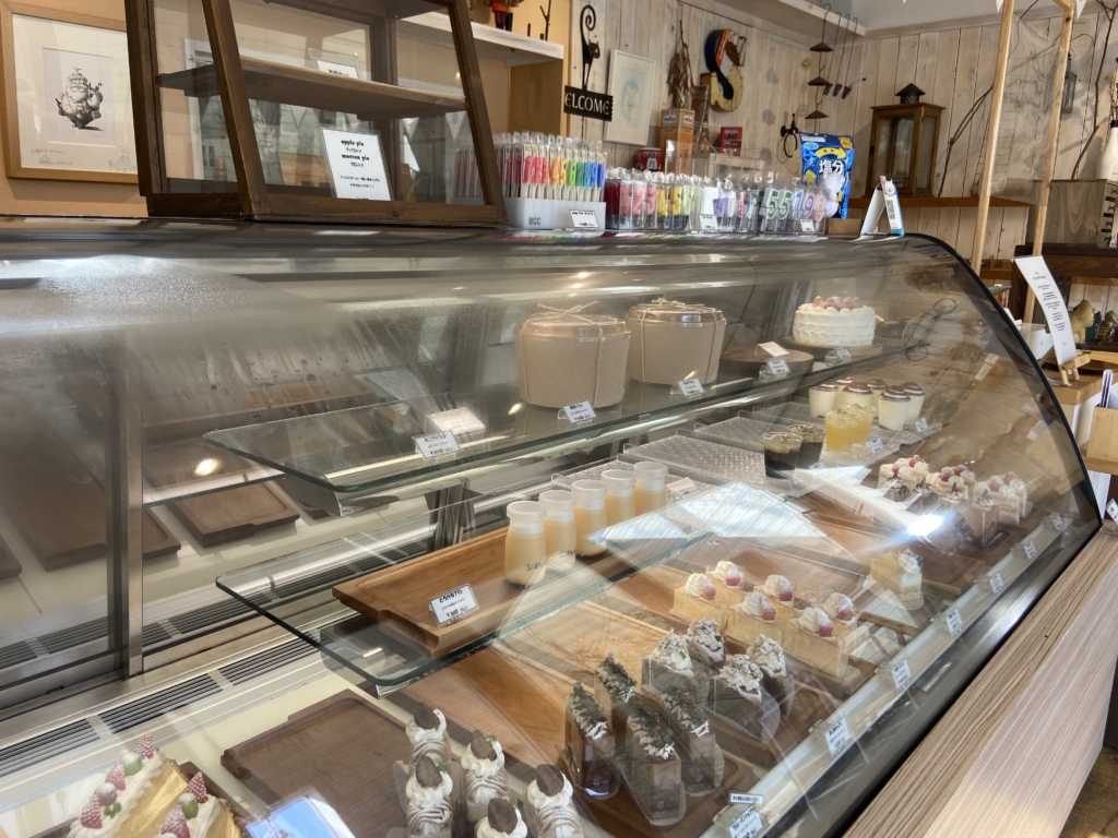 店内に入ると、様々なケーキが入ったショーケースはもちろん、その上には、カラフルな雑貨が並べられています。