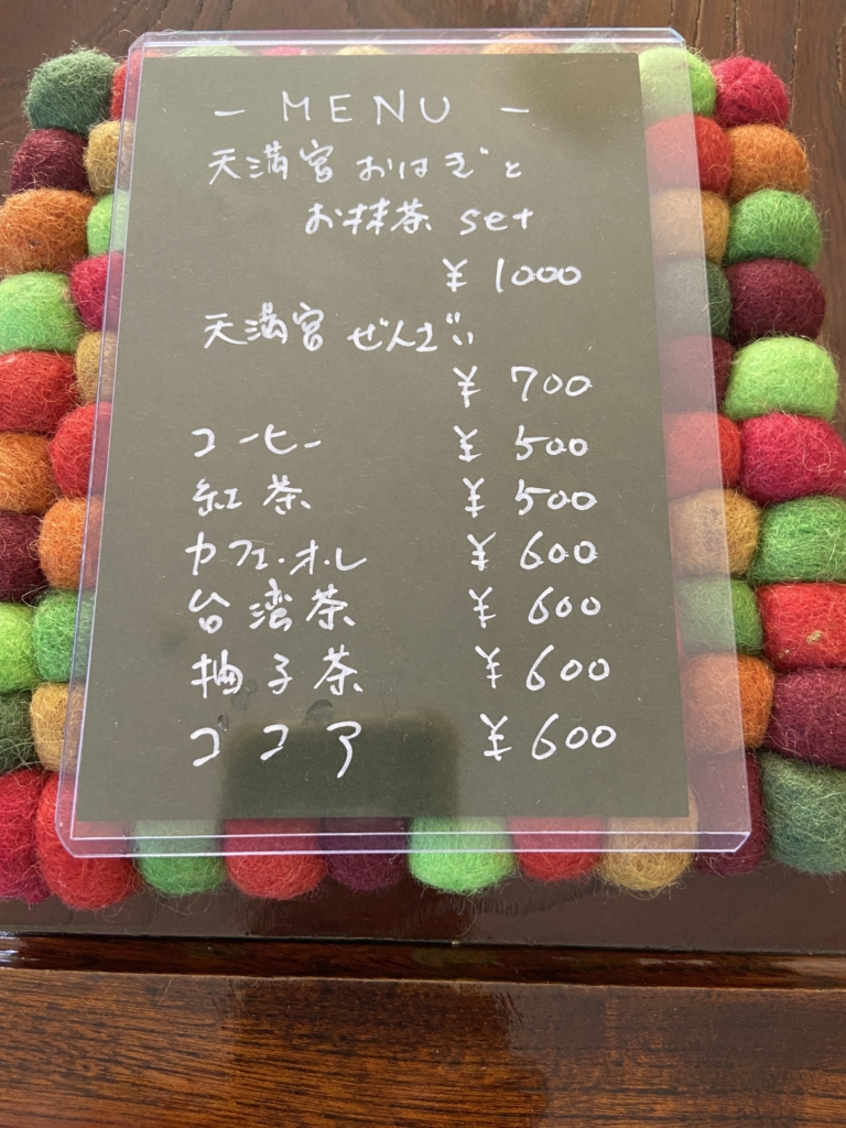 外にあるメニューは、「おでん」に「ぜんざい」「玉露」「あご出汁のおにぎり」。ちょっとお参りの帰りにホッとひといきつく場所です。